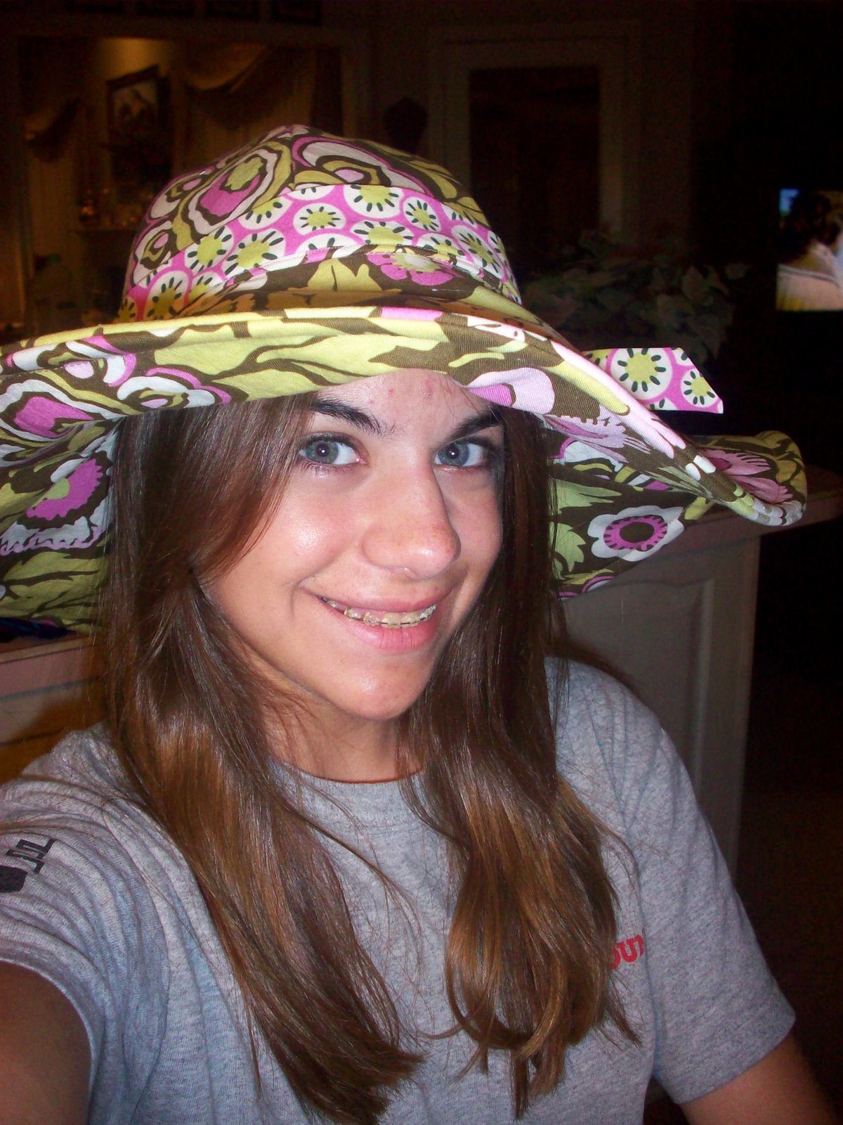 Both are Amy Butler Patterns and fabric. The fabric was purchased, but on sale at half price. I love, love, love this print and color! The lovely model is Teen Daughter#1. She wants the hat.