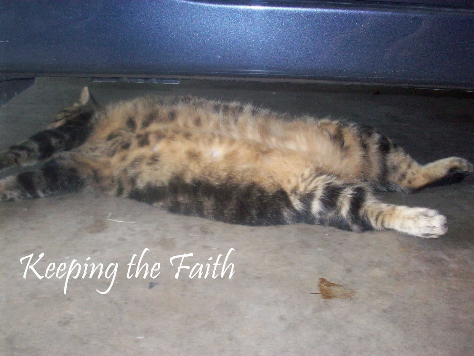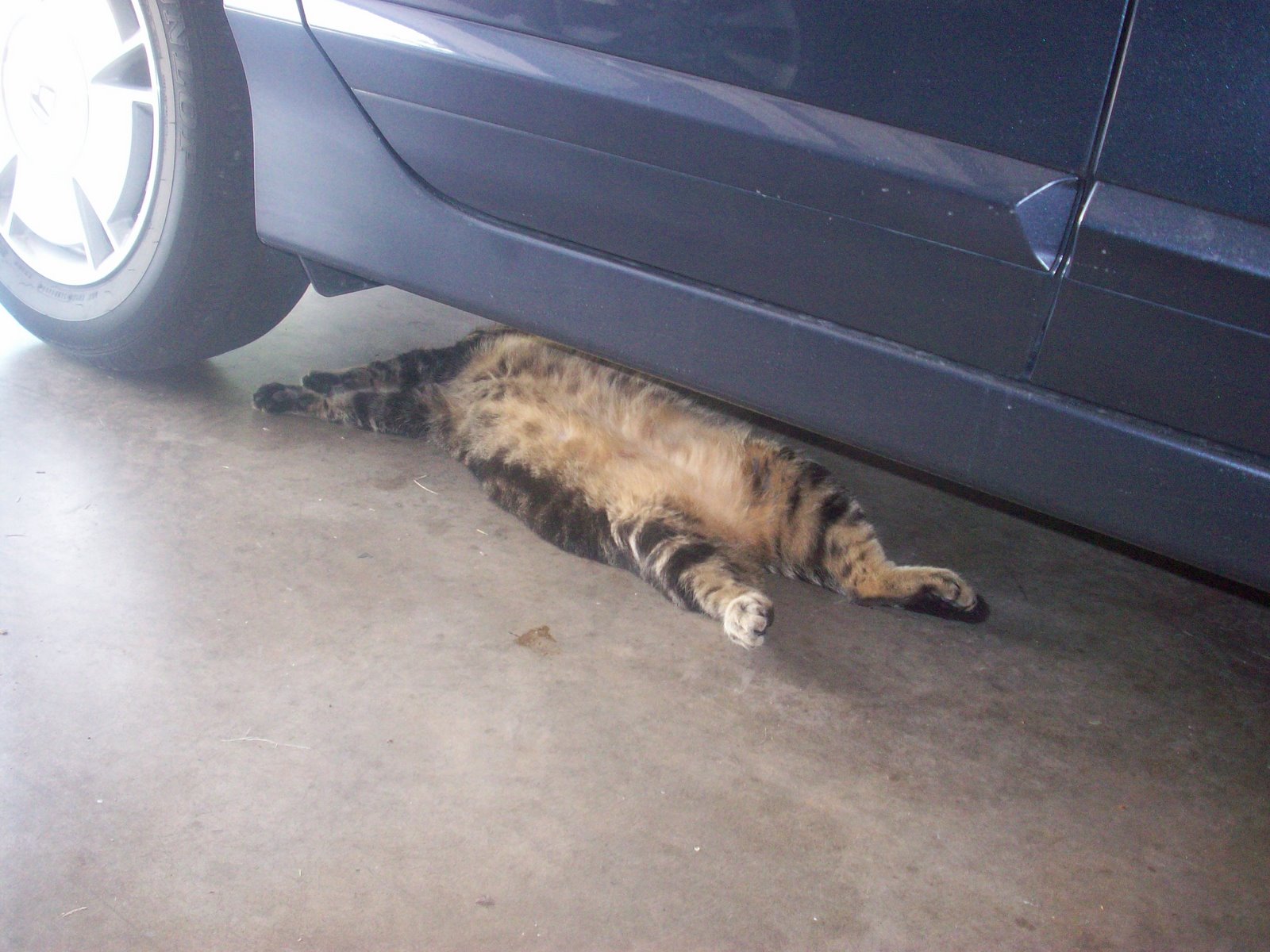She also sleeps flat on her back, in the strangest locations. It’s not unusual to find her upside down smack in the middle of the living room floor; in the bathtub; or on top of the washing machine. I’ve seen her upside down on the pool table, with her head hanging over the edge and her mouth wide open, sound asleep. This by far is the strangest – lying on the garage floor under the wheel of the car. I had to remind Teen Daughter#1 to wake the cat up before backing out.