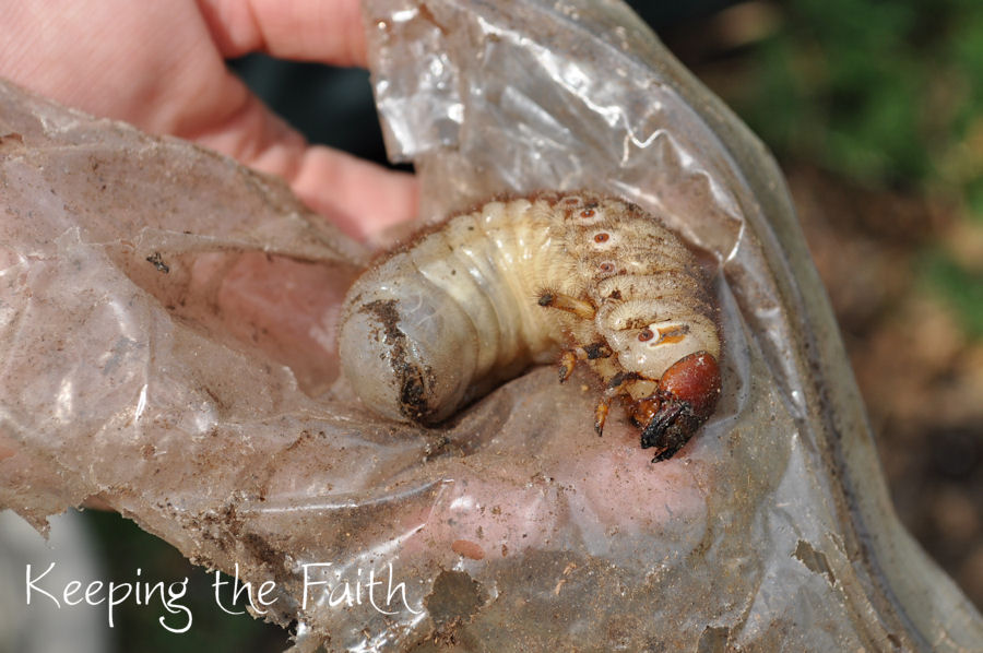 Composting is not without some inherent danger, however. Remember that part a few paragraphs back about “insects” breaking down the organic matter? There are some creepy critters who like to take up residence and overwinter in our compost bin – like this ‘little’ guy. He’s a stag beetle larvae. I found him when spreading compost this past weekend. I put him gently back in the bottom of the bin when I was done, so he can finish mutating into an fierce warrior beetle.