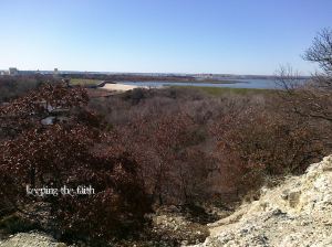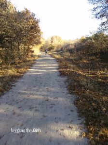 Tough enough yet?  Monday Mr. Pea decided we should take a ride on Mineral Wells Trailway.  It was another beautiful day, and thank goodness the sun was shining, because the wind was just a bit sharp against the skin. We took all the Pea kids plus a few extras, and made the run to the halfway point and back. The older boys made it all the way to the halfway point; the rest of us turned around a few miles shy because we were getting cold. Grand total of fifteen miles.  (That’s DirtBike ahead of me in the picture.)