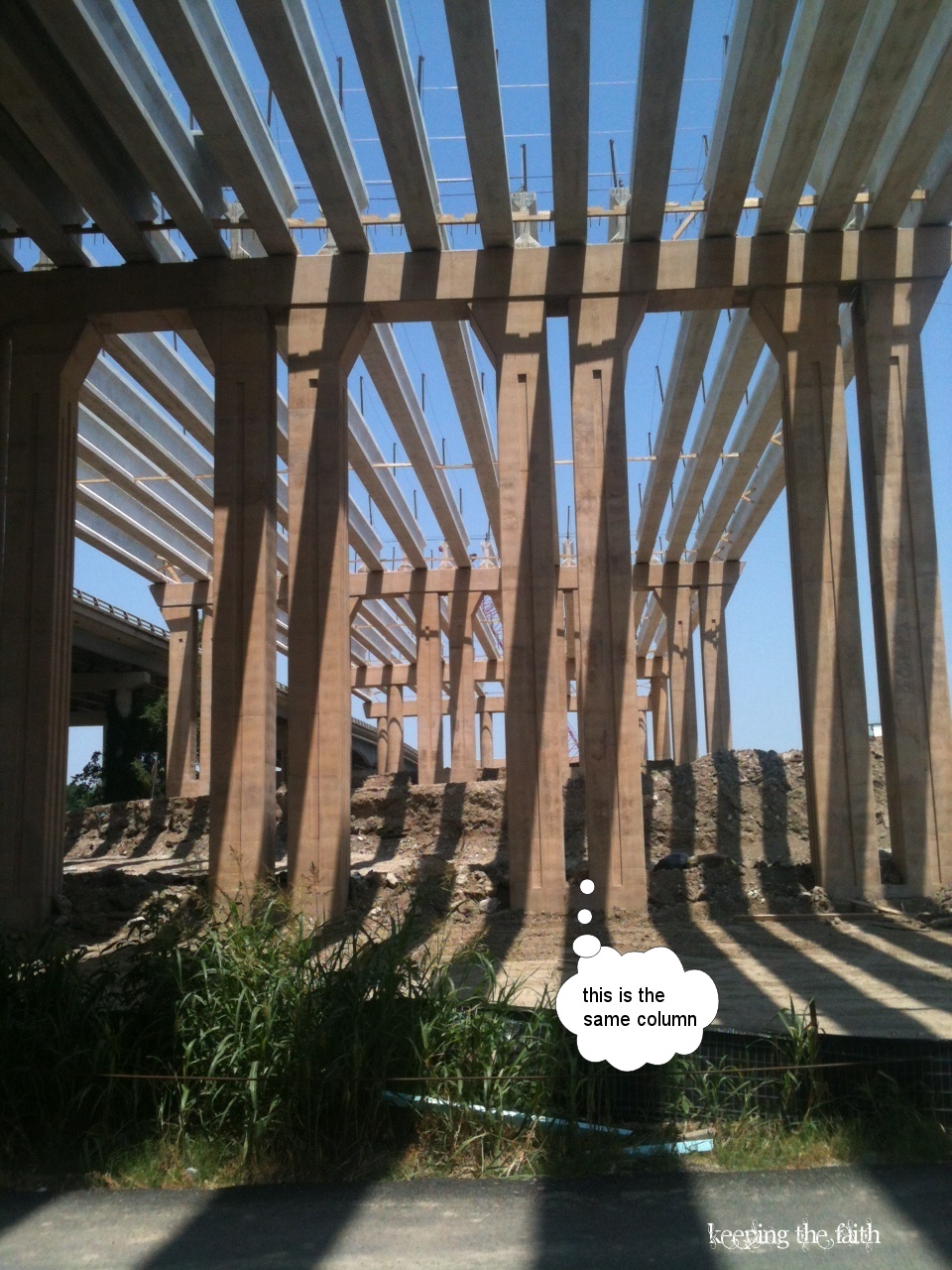 There was a [brave] guy braced between the two halves about 30 feet off the ground, supporting his weight with his feet, bolting the sides of the form in place while it dangles from the crane over his head.  I went riding today, and this is what it looks like now.