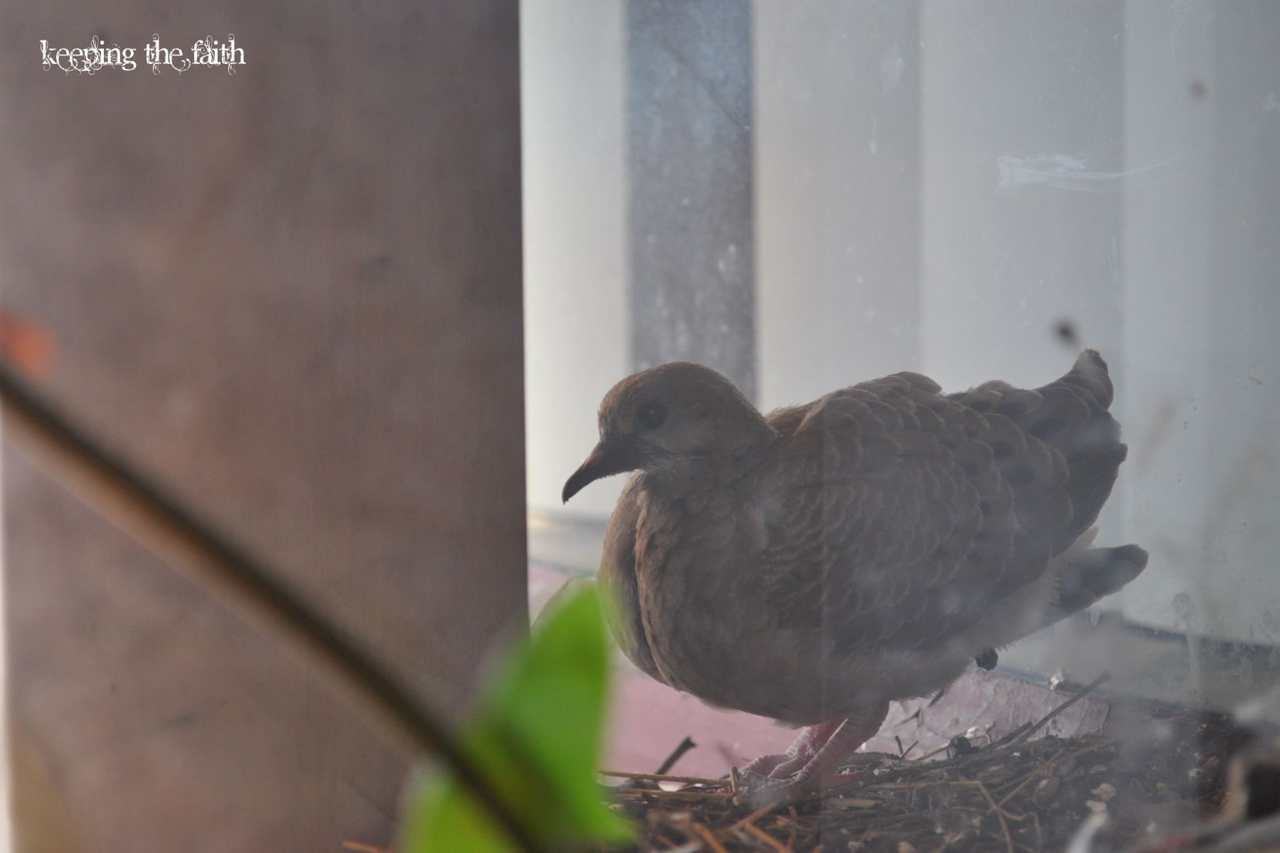 There a dove’s nest on the ledge of my office window. Mom Dove builds a nest there every spring. Or maybe her offspring, as this is the sixth year in a row there’s been a nest in the corner.  I enjoy hearing the cooing as Mom Dove comes and goes; watching the eggs hatch; and then watching the baby birds grow.  I do worry about them falling before they are feathered out, as my office is on the second floor and a dove’s idea of a nest is to toss a few sticks and blades of grass down and call it done. The baby is a fledgling now and can fly!