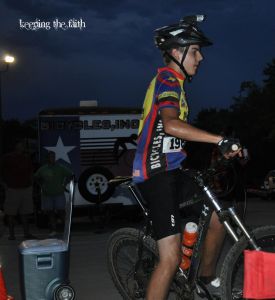 The entire Pea Family rode in the Parker County Peach Festival this weekend. 26 miles of fun for all of us except The Architect.  He only did the 9 mile loop because he rode in the Smurf Boy endurance race the same evening:  four hours of single track goodness.  There wasn’t a junior division, so he was riding with the big boys, men 39 and under. He came in 6th place, completing 6 loops in the four hours, stopping only to change flat tires and refill water bottles.  Oh, and the last hour or so of the race was in the DARK!  With Headlamps!