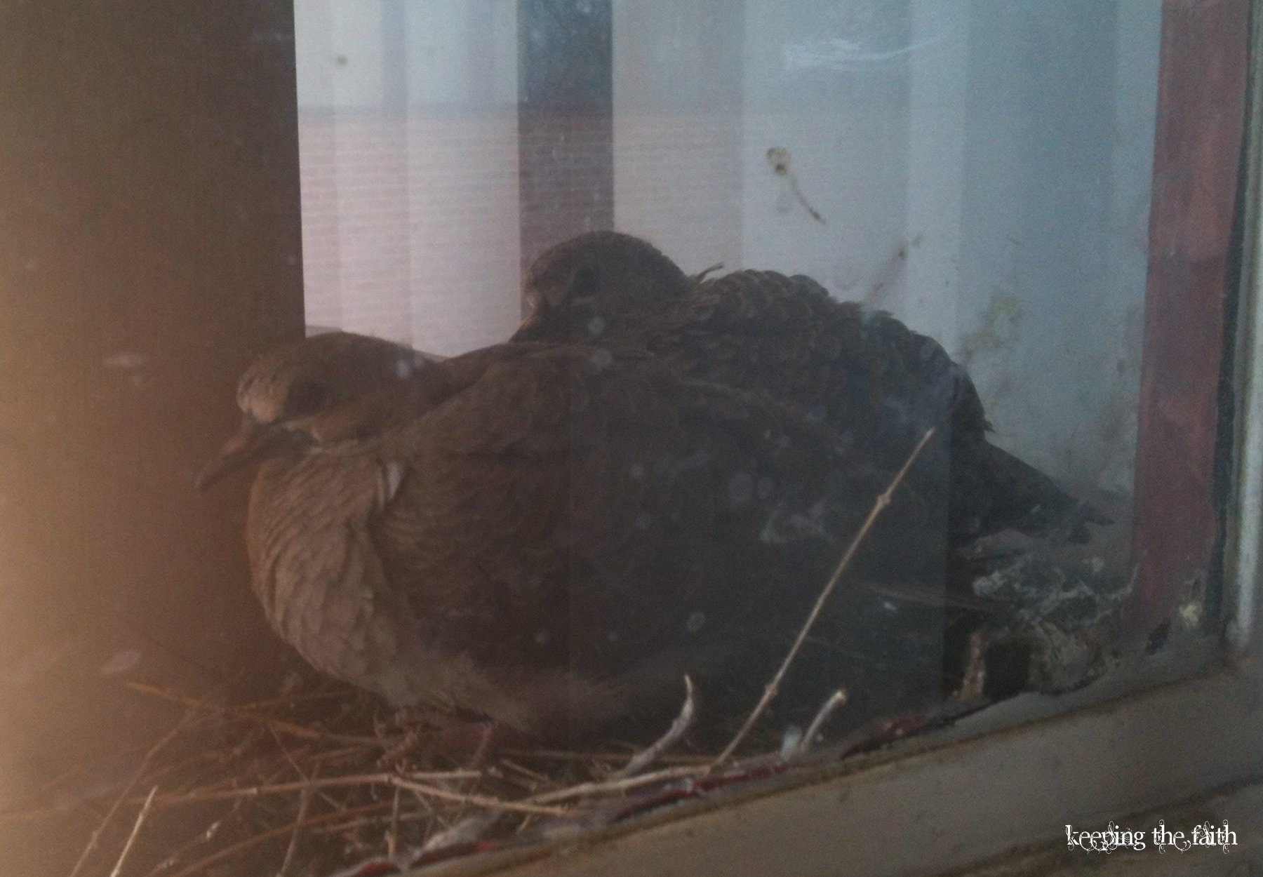 Dear Windowsill Dove Babies – Wow, you grew up fast. I looked out Tuesday morning to see you both strutting up and down the windowsill in front of my window! Now you have fluttered to the ground and are hanging out in the shrubbery where your parents still bring you an occasional bite to eat. Live long and prosper!